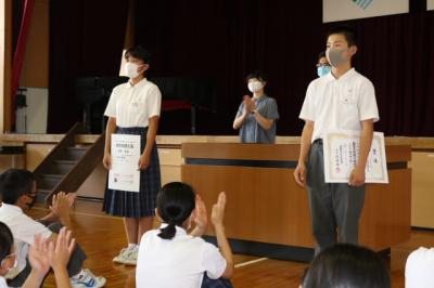 続いて、表彰集会を行いました。 剣道と陸上の大会の表彰がありました。