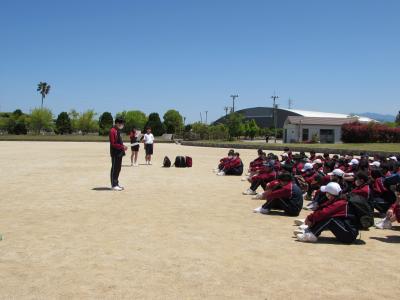 東予運動公園到着後、クラスごとに集合写真を撮り、クラスマッチを行いました。