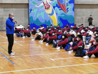 退所式 2022年4月23日 15時45分 楽しかった自然の家も全ての活動を終了しました。退所式では、所員や教頭先生からは、仲間や絆についてお話をしていただきました。生徒代表がお礼の言葉を述べて退所式が終わりました。 バスが出発しました。バス内の様子です。